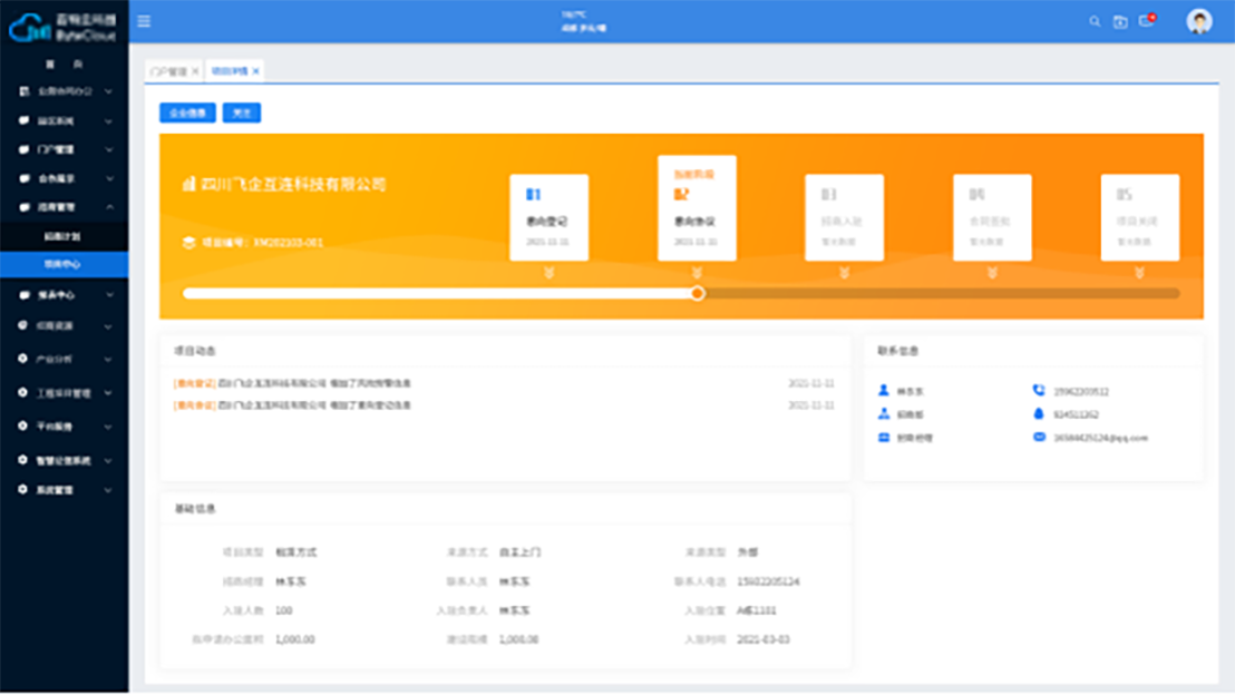 实时跟踪项目的状态,可查看项目的基本信息、企业信息、跟踪项目情况、关注项目等功能,可通过里程碑进行查看不同阶段的项目