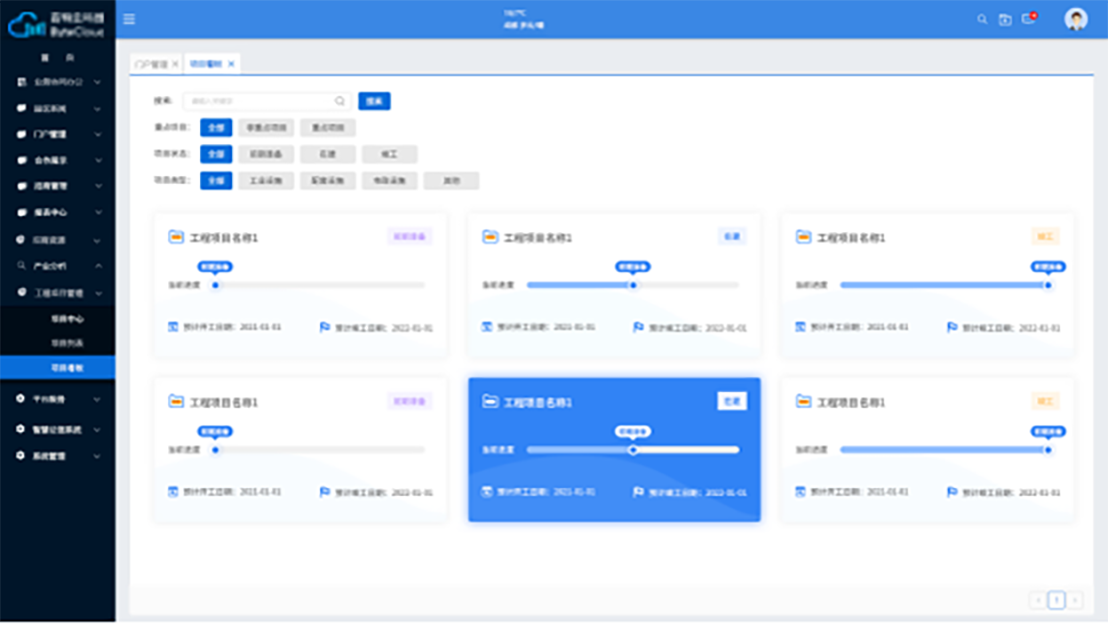 实现园区的工程项目的整体监管,涵盖工程项目总数、重点项目推进情况、项目预警提醒等功能实现工程项目管理的添加、修改后展示,可以通过不同类型筛选后进行查看,项目的状态实时展示
