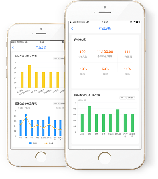 支持APP+web端,实现对园区的产业情况分析进行统计,包含产业总览,园区企业分布及产值情况、产业分布及产值情况、园区税收情况、企业规模、企业园龄统计等功能