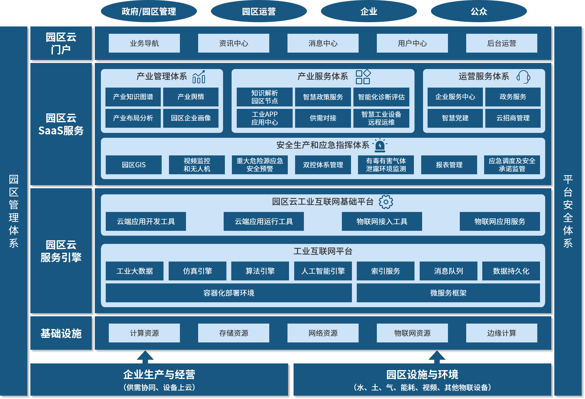 以工业互联网平台和园区中台作为云平台服务引擎向上面向园区产业管理、产业服务、运营服务及安全生产和应急指挥体系提供支撑能力