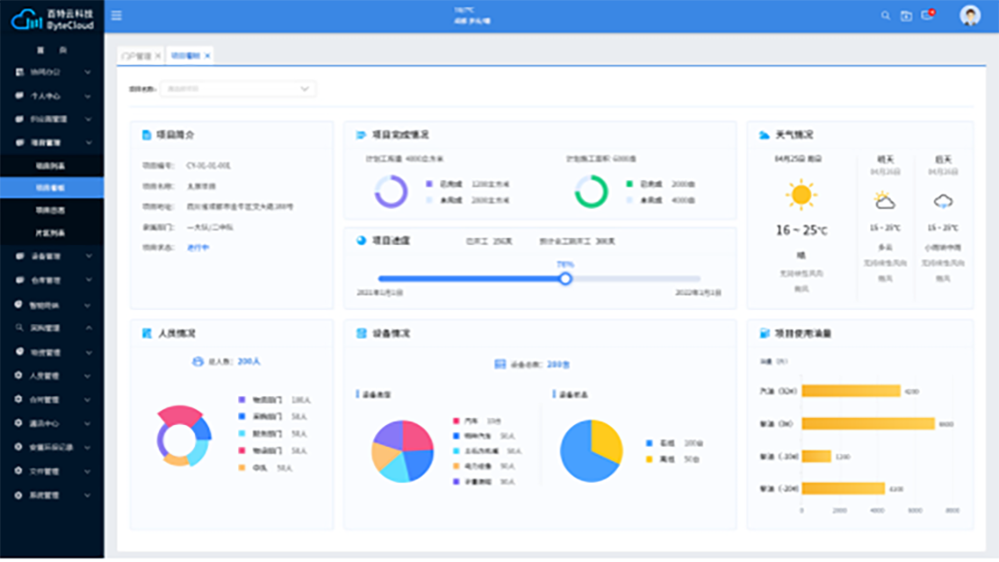 根据项目人员填报的日报进行实时汇总,实时监控项目动态,可通过筛选项目精准查看项目的完成情况、人员情况、设备情况、使用油量等数据