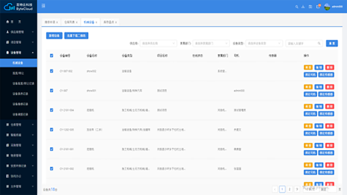 实现对机械设备的管理和维护。包含设备新建、编辑、绑定司机、绑定传感器、设备调拨、删除、批量下载二维码、设备详情(基础信息、整机信息、技术参数、设备动态台账)等功能