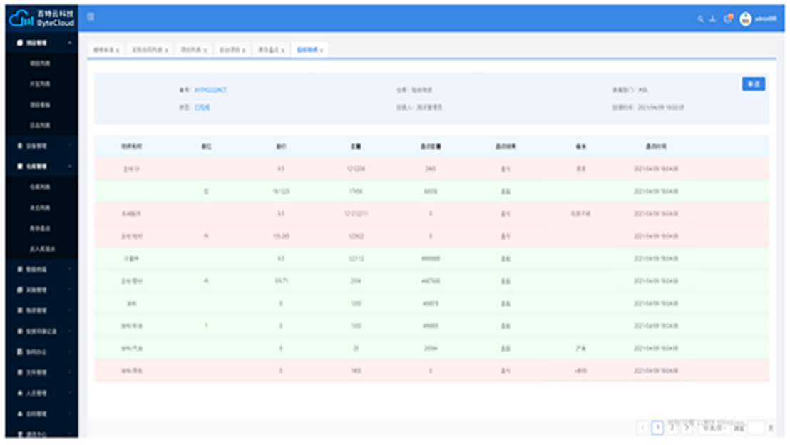 实现对库存的管理和维护。可查看库存盘点当前的实时状况,包含盘亏、盘盈一致,可针对盘亏盘盈的物资进行再次核对,且能导出当前的库存数据