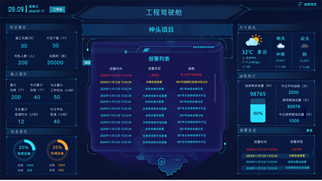 系统自动检测人员头盔状态、机械设备状态、库存状态进行异常报警,根据不同报警类型、等级在工程驾驶舱页面实时弹出进行处理